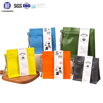 थोक नमी-प्रूफ कॉफी पैकेजिंग बैग स्टॉक में लैनीनार्ड के साथ फ्लैट तल जिपर पाउच